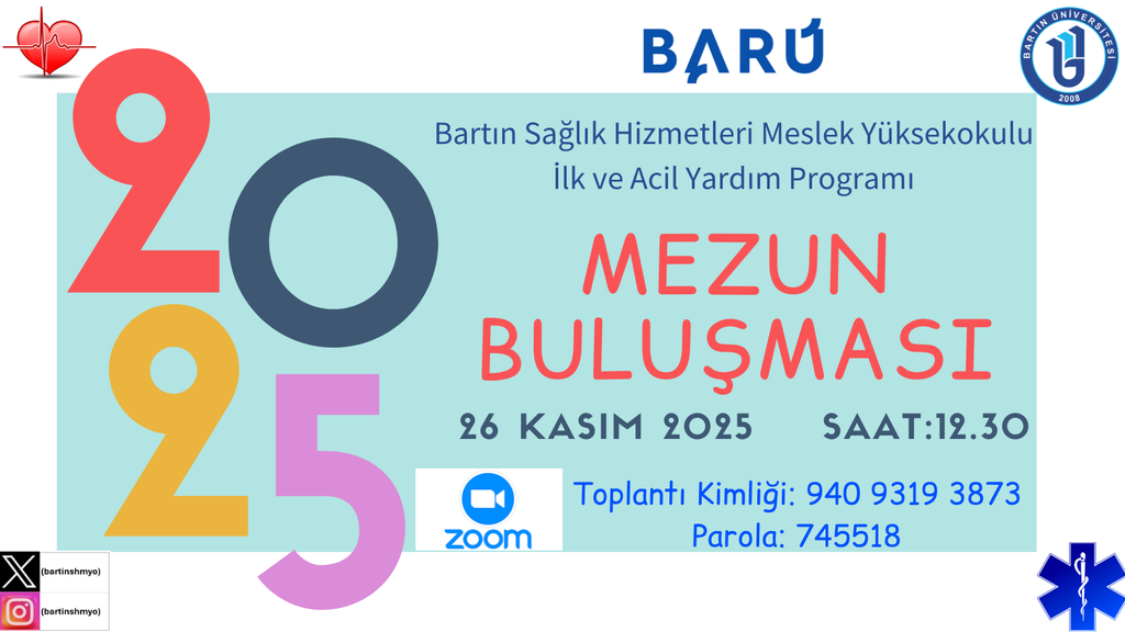 Yüksekokulumuz İlk ve Acil Yardım Programı 2025 yılı mezun buluşması online olarak 26 Kasım 2025 saat: 12:30 da gerçekleştirildi.